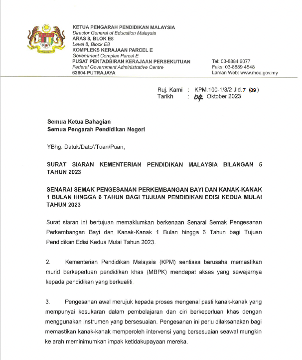 Surat Siaran KPM Bil. 5 tahun 2023 Senarai Semak Pengesanan Perkembangan Bayi & Kanak-Kanak 1 Bulan Hingga 6 tahun
